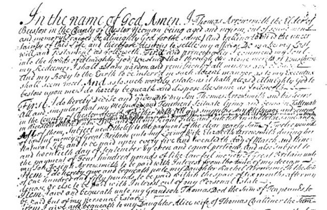 [11] First I do hereby Devise and give unto my Son Thomas Arrowsmith and his heirs