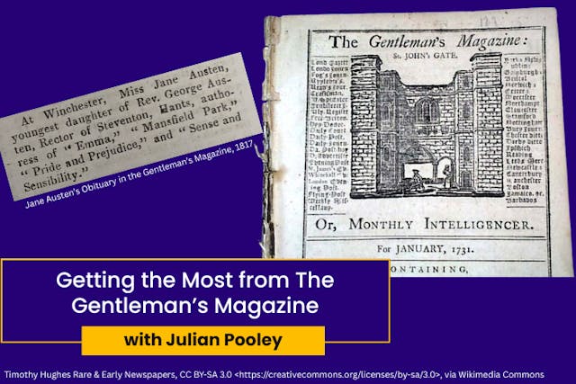 Finally on 13th December we have a treat for all Janeites, and everyone with Regency English ancestors, in the morning Julian Pooley will join us to explain how genealogists can “Get the Most from The Gentlemans’ Magazine.” Jane Austen’s obituary was printed in the closely printed pages in 1817, and we can be fairly sure that the men in Jane’s life, both real and fictional read the magazine. Every column inch of print provides vital details for our family trees.